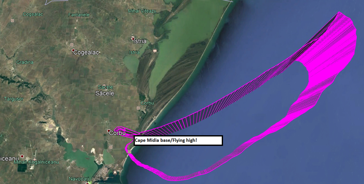 The UAV had several sensors onboard aimed at measuring atmosphere parameters (pressure, temperature, humidity). The flight was performed up to 27 km altitude and the duration of the flight was ~ 4 hours of flight time. The maximum distance of the UAV from the launch position was ~47 km Nort-East (over the Black Sea).