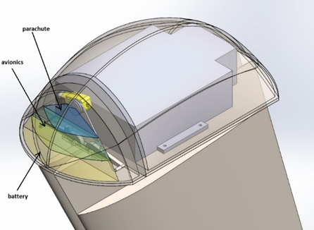 Parachute, avionics, battery compartments
